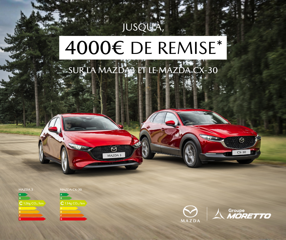 * 4 000€ de remise sur Mazda3 neuve (remise initiale de 2500€ depuis le 1er juillet 2025 et remise complémentaire de 1500€ à partir du 1er octobre 2025) et 4 000€ de remise sur Mazda CX-30 neuf (remise initiale de 2800€ depuis le 1er juillet 2025 et remise complémentaire de 1200€ à partir du 1er octobre 2025) par rapport au prix catalogue au 1er juin 2025.