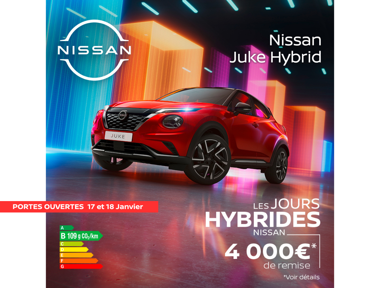 (3) Offre réservée aux particuliers pour l'achat d'un Juke 2026 neuf par rapport au prix au 01/01/2026, non cumulable avec d'autres offres, valable jusqu’au 31/01/2026 chez les concessionnaires Nissan participants. Applicable aux motorisations Essence et Hybride, dans la limite des stocks disponibles. Détails : Nissan.fr. Modèle présenté : Nissan Juke Hybrid 143 N-Sport Gamme 2026 neuf, au prix de 32 550€, après déduction d'une remise de 4 000€. (4) Garantie additionnelle (groupe motopropulseur) sur véhicules particuliers neufs jusqu’à prochaine échéance d’entretien (annuelle ou kilométrique), activée à chaque entretien dans le réseau NISSAN, au-delà garantie constructeur, jusqu'à 8 ans, limité à 160 000 km. Conditions Générales : nissan.fr. NISSAN WEST EUROPE SAS : nissan.fr. Consommations gamme cycle combiné (l/100km) : 4,7 - 4,8. Émissions CO₂ (g/km) : 105 - 109.