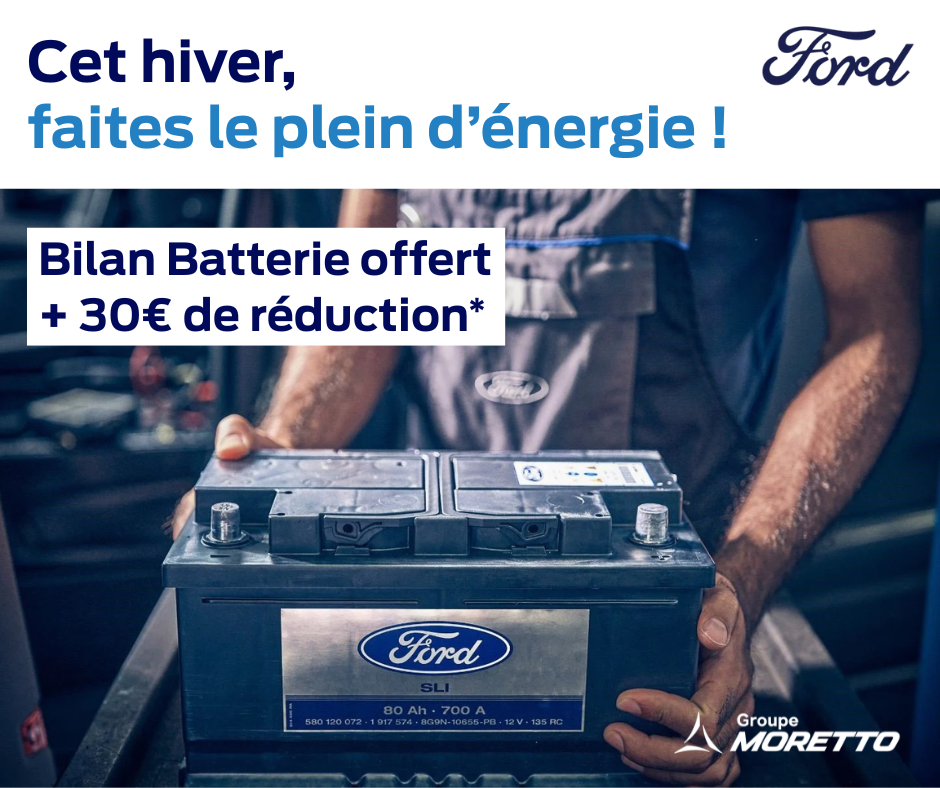 *Du 01/02/2026 au 13/02/2026, bilan de votre batterie 12V offert + 30€ TTC de réduction conditionnée par l'achat d'une batterie 12V neuve (reprise de l'ancienne batterie 12V). Cette offre est valable dans vos concessions Ford du Groupe Moretto. Offre non cumulable avec d'autres offres promotionnelles en cours.