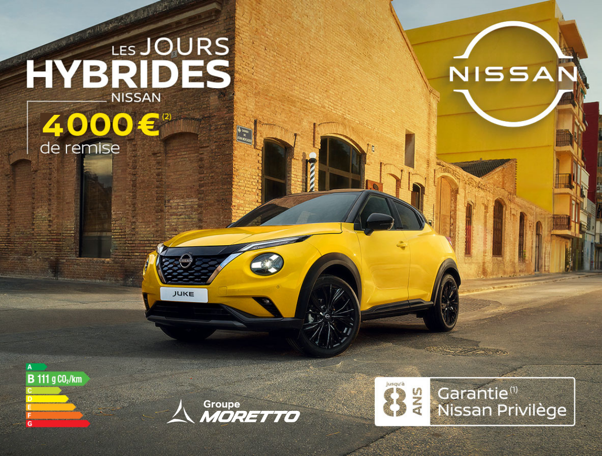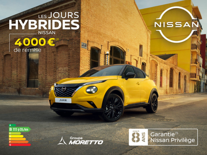 (1) Offre réservée aux particuliers pour l'achat d'un Juke 2026 neuf par rapport au prix au 01/03/2026, non cumulable avec d'autres offres, valable jusqu’au 30/04/2026 - chez les concessionnaires Nissan participants. Applicable aux motorisations Essence et Hybride, dans la limite des stocks disponibles. Détails : Nissan.fr. Modèle présenté : Nissan JUKE HYBRID 143 N-Sport neuf, au prix de 31 550€, après déduction d'une remise de 5 000€. (2) Garantie additionnelle (groupe motopropulseur) sur véhicules particuliers neufs jusqu’à prochaine échéance d’entretien (annuelle ou kilométrique), activée à chaque entretien dans le réseau NISSAN, au-delà garantie constructeur, jusqu'à 8 ans, limité à 160 000 km. Conditions Générales : nissan.fr. NISSAN WEST EUROPE SAS : nissan.fr. Consommations gamme cycle combiné (l/100km) : 4,6 - 6,1. Émissions CO₂ (g/km) : 105 - 139.